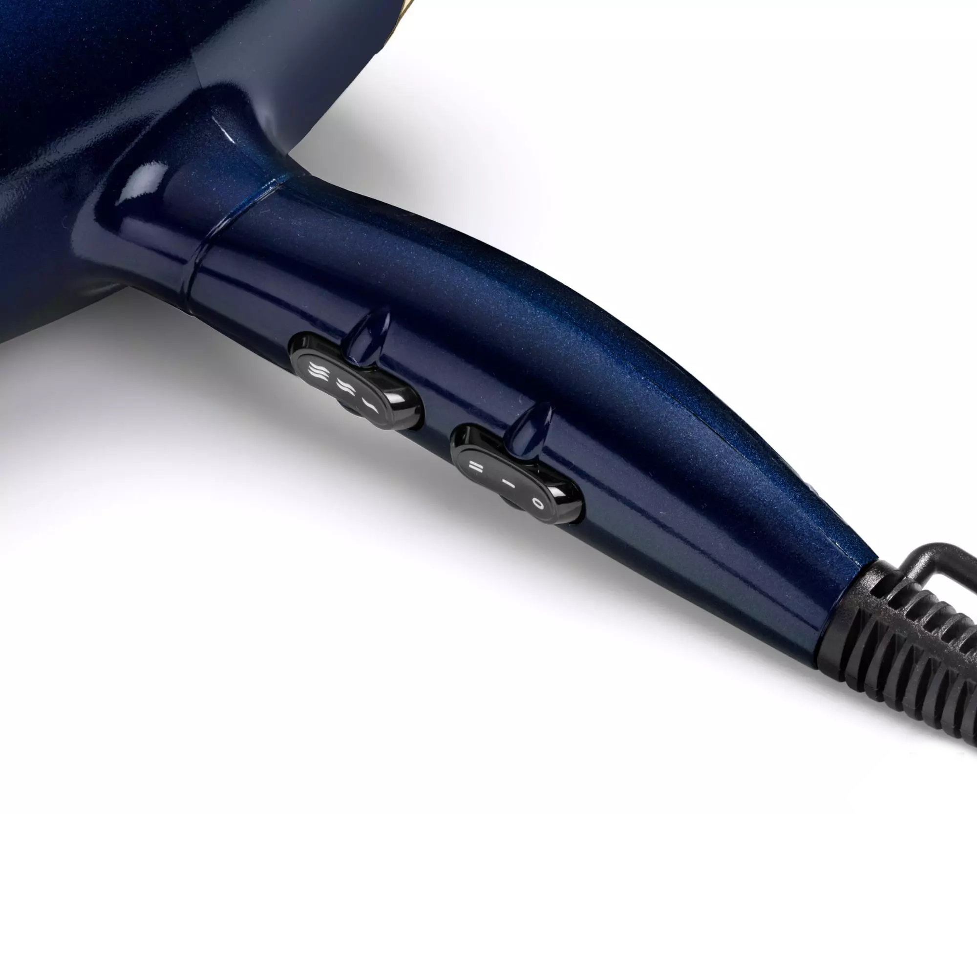 Fen za kosu Babyliss Black Onyx 5911E brzo će i učinkovito osušiti vašu kosu, bez oštećenja. Dolazi sa standardnom mlaznicom. Ima lagani AC motor od 2000 W, tri različite postavke temperature i dvije brzine. Osim luksuzne, sjajne završne obrade sa zlatnim detaljima, Black Onyx je jednostavan i lagan za rukovanje, teži samo 744 g. S dugim kablom od 2,5 m, možete ga slobodno manevrirati za potpunu slobodu tijekom stiliziranja.